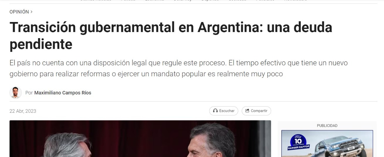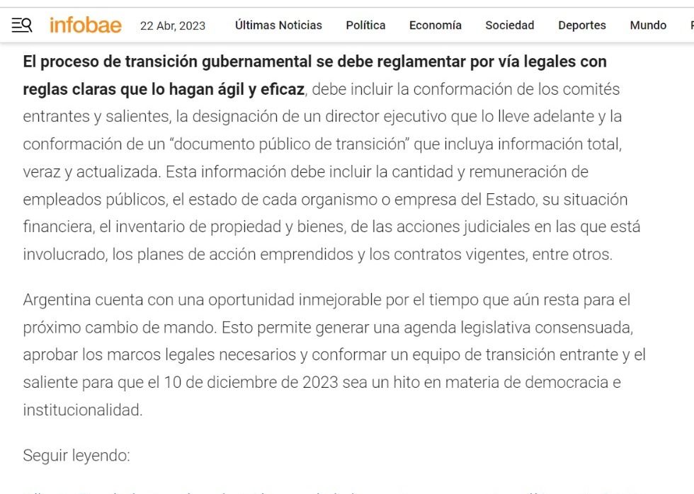 Argentina cuenta con una oportunidad inmejorable por el tiempo que aún resta para el próximo cambio de mando. Esto permite generar una agenda legislativa consensuada, aprobar los marcos legales necesarios y conformar un equipo de transición entrante y el saliente para que el 10 de diciembre de 2023 sea un hito en materia de democracia e institucionalidad.
