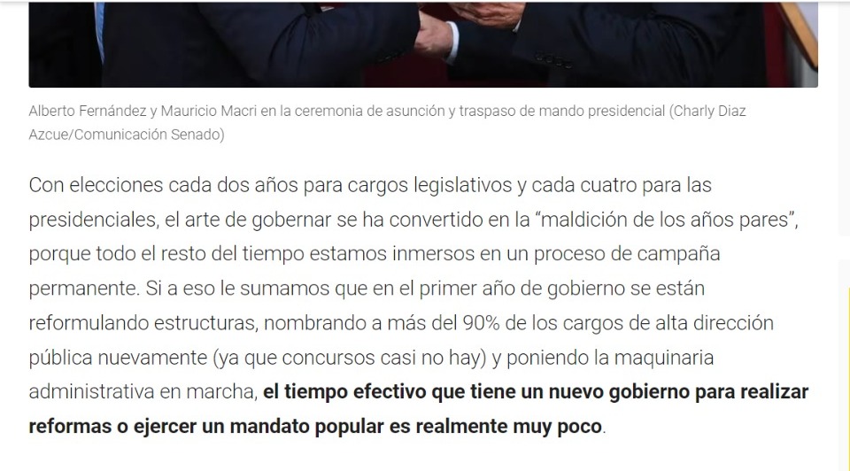 Con elecciones cada dos años para cargos legislativos y cada cuatro para las presidenciales, el arte de gobernar se ha convertido en la “maldición de los años pares”, porque todo el resto del tiempo estamos inmersos en un proceso de campaña permanente. Si a eso le sumamos que en el primer año de gobierno se están reformulando estructuras, nombrando a más del 90% de los cargos de alta dirección pública nuevamente (ya que concursos casi no hay) y poniendo la maquinaria administrativa en marcha, el tiempo efectivo que tiene un nuevo gobierno para realizar reformas o ejercer un mandato popular es realmente muy poco.