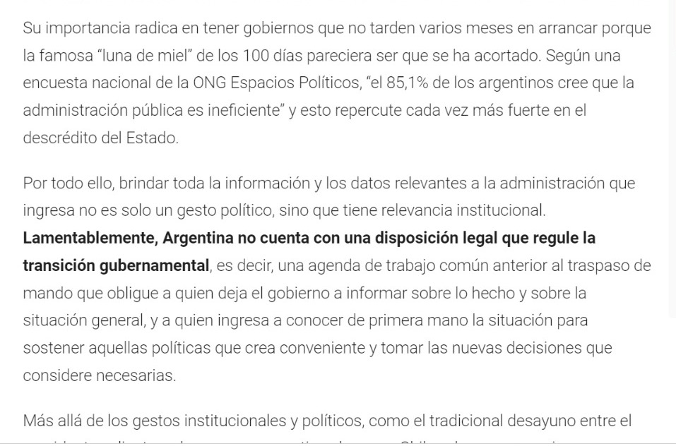 Por todo ello, brindar toda la información y los datos relevantes a la administración que ingresa no es solo un gesto político, sino que tiene relevancia institucional. Lamentablemente, Argentina no cuenta con una disposición legal que regule la transición gubernamental, es decir, una agenda de trabajo común anterior al traspaso de mando que obligue a quien deja el gobierno a informar sobre lo hecho y sobre la situación general, y a quien ingresa a conocer de primera mano la situación para sostener aquellas políticas que crea conveniente y tomar las nuevas decisiones que considere necesarias.