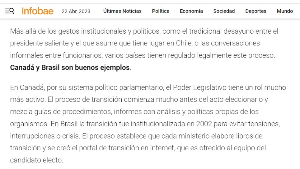 En Canadá, por su sistema político parlamentario, el Poder Legislativo tiene un rol mucho más activo. El proceso de transición comienza mucho antes del acto eleccionario y mezcla guías de procedimientos, informes con análisis y políticas propias de los organismos. En Brasil la transición fue institucionalizada en 2002 para evitar tensiones, interrupciones o crisis. El proceso establece que cada ministerio elabore libros de transición y se creó el portal de transición en internet, que es ofrecido al equipo del candidato electo.